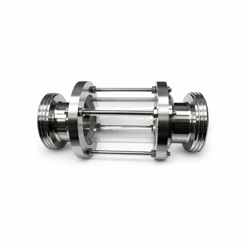 Dank der transparenten Glasrohre kann der Durchfluss visuell kontrolliert werden – ohne den Prozess zu unterbrechen. Zum Schutz bei mechanischer Beanspruchung ist das Schauglas mit Schutzstäben aus Edelstahl 1.4301 ausgestattet. Die Verbindung erfolgt über genormte Milchgewinde.